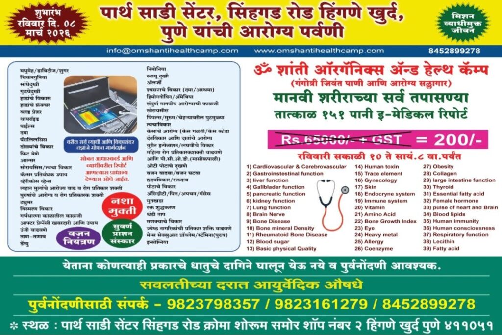 हिंगणे परिसरातील पार्थ साडी येथे द न्यू लाइफ फाउंडेशन आणि ओम शांती हेल्थ कॅम्प यांच्या संयुक्त विद्यमाने मोफत आरोग्य शिबिराचे आयोजन करण्यात आले. या शिबिराचा पुढाकार सामाजिक कार्यकर्त्या व द न्यू लाइफ फाउंडेशनच्या संस्थापक अध्यक्षा अश्विनी गोरे तसेच ओम शांत हेल्थ कॅम्पचे अध्यक्ष जितेंद्र पुंडे यांनी घेतला होता.